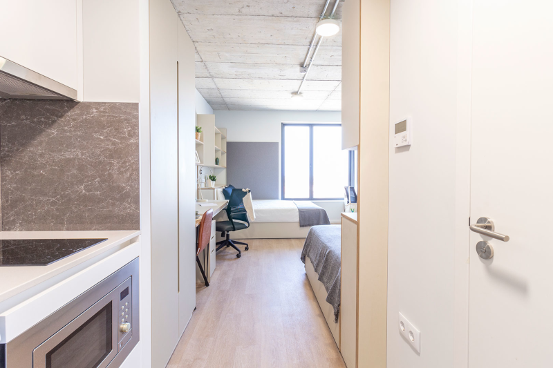 Ideal for budget-conscious students, Twin Studio Economic combines affordability with functionality. It features two small double beds, perfect for roommates who value personal space. Each resident has a dedicated study desk and plenty of storage options, including a wardrobe and chest of drawers. The private kitchen (shared between 2) is equipped with modern appliances, including a dishwasher and breakfast bar, making meal prep hassle-free. A private bathroom (shared between 2) offers all the essentials, ensuring convenience.