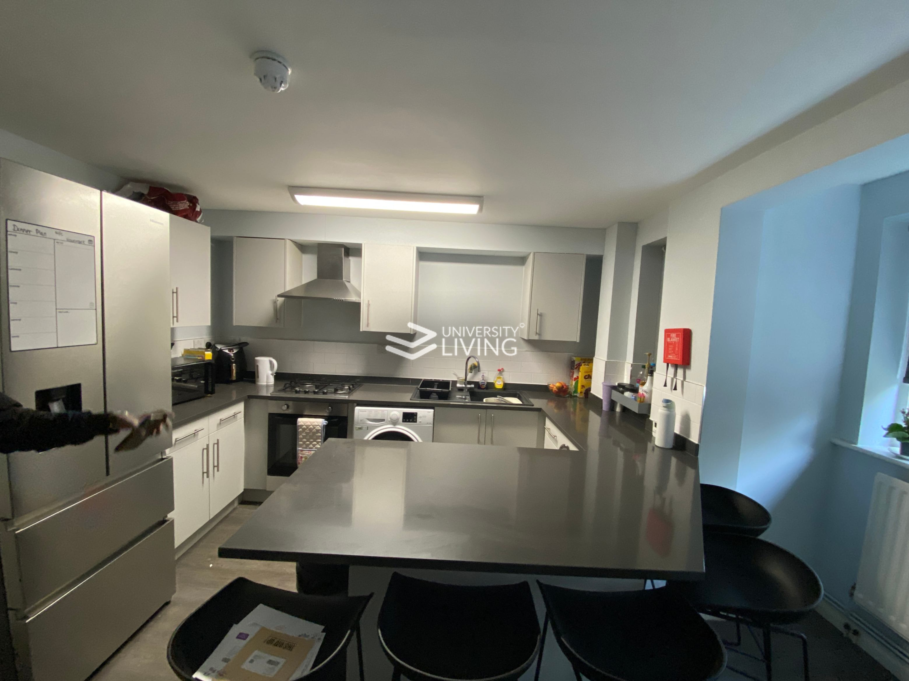 The Silver – Ground Floor room features a comfortable small double bed, study desk with chair, wardrobe, chest of drawers, plenty of storage, shelves, and a pin board—perfect for organizing your essentials. Large windows bring in natural light, creating a bright and welcoming space. You’ll share two bathrooms, a social living area, and a fully equipped kitchen with up to four other residents. Each kitchen includes a fridge freezer, oven, and microwave, making it easy to prepare meals and enjoy communal living in a friendly, convenient environment.
