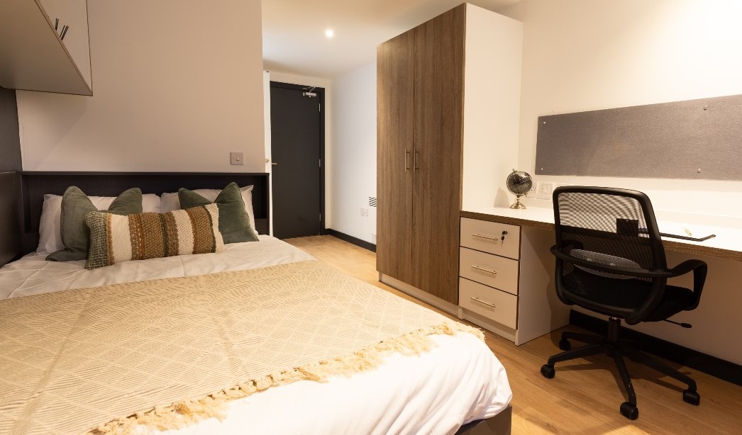 These are a larger size and fully-furnished rooms that have a ¾ size double bed with under-bed storage, an en-suite bathroom with shower and WC, a full-length mirror, pinboard, wardrobe, Wifi, study desk with drawer space, and chair. The shared kitchen has a 4-ring hob with extractor, electric oven, full-size fridge freezer, and dining table and chairs. There is a common lounge with a sofa area and communal TV.