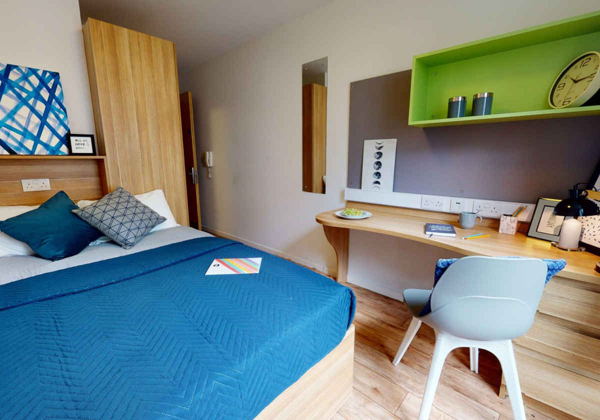 The Bronze Ensuite delivers the essentials of student living with comfort and style. It features a small double bed with underbed storage, a study area complete with desk and chair, shelves, and a wardrobe for convenient storage. A private bathroom with a shower, washbasin, and toilet offers the independence you need. A full-length mirror and generous window bring functionality and natural light to the space. Outside the room, you'll share a well-equipped kitchen, cozy dining area, and lounge with your flatmates—ideal for building friendships and winding down after a busy day. This ensuite is a great choice for those who value privacy without missing out on community living.