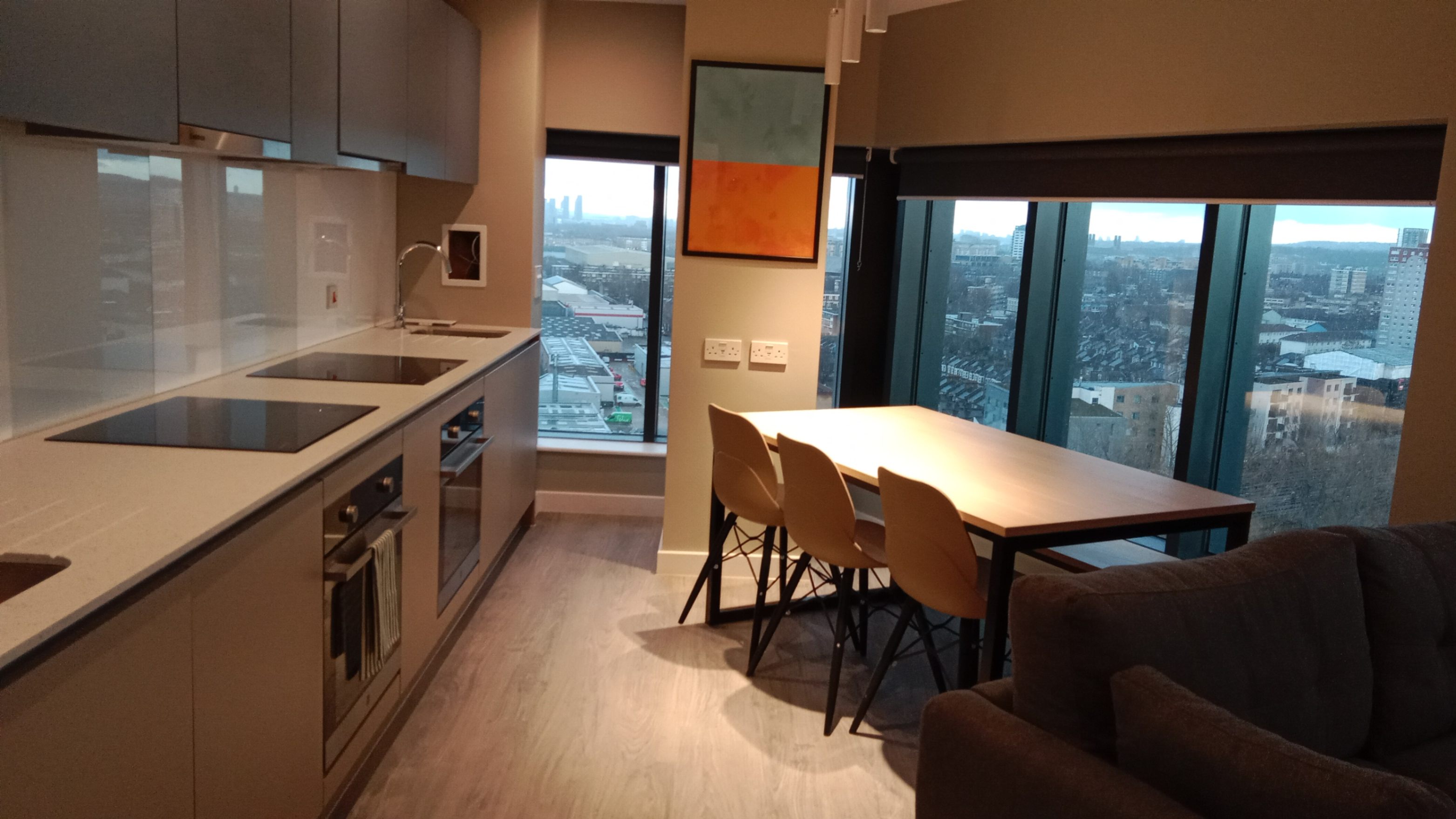 The Standard 9‑Bed En‑Suite offers a bright and functional environment ideal for shared living. Each bedroom includes a double bed, wardrobe, desk, chair, shelves, and drawers, plus a private bathroom with shower, toilet, washbasin, mirror, and towel holder. Large windows provide refreshing natural light, creating an uplifting study atmosphere. Residents enjoy access to a shared fully-equipped kitchen, dining area, and living space, perfect for group meals and social evenings. The thoughtful layout encourages collaborative living while still maintaining individual privacy. It’s an excellent choice for students seeking an affordable living option with dedicated personal space and communal amenities that support both studying and community engagement.