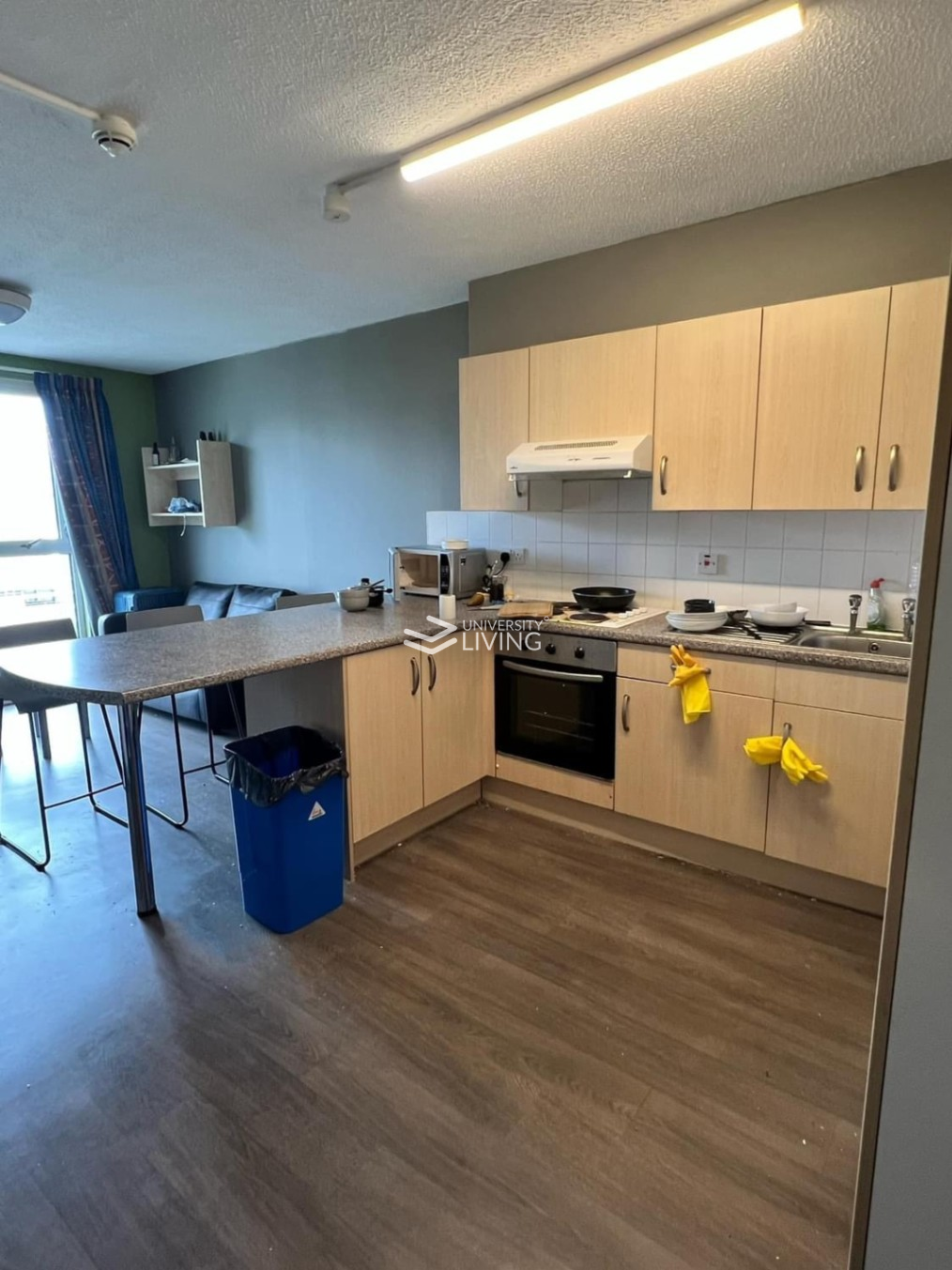 Enjoy privacy and comfort in this e xtra large standard double ensuite room with your own bathroom, set within a shared flat housing 3 to 5 flatmates. The room features a double bed, wardrobe, desk, and washbasin, plus under-bed storage. The shared kitchen and lounge include modern appliances such as an oven, microwave, cooking hobs, and fridge freezer. A breakfast bar with stools and a sofa provide a great place to unwind. Cleaning tools and ventilation complete this practical and friendly student home.