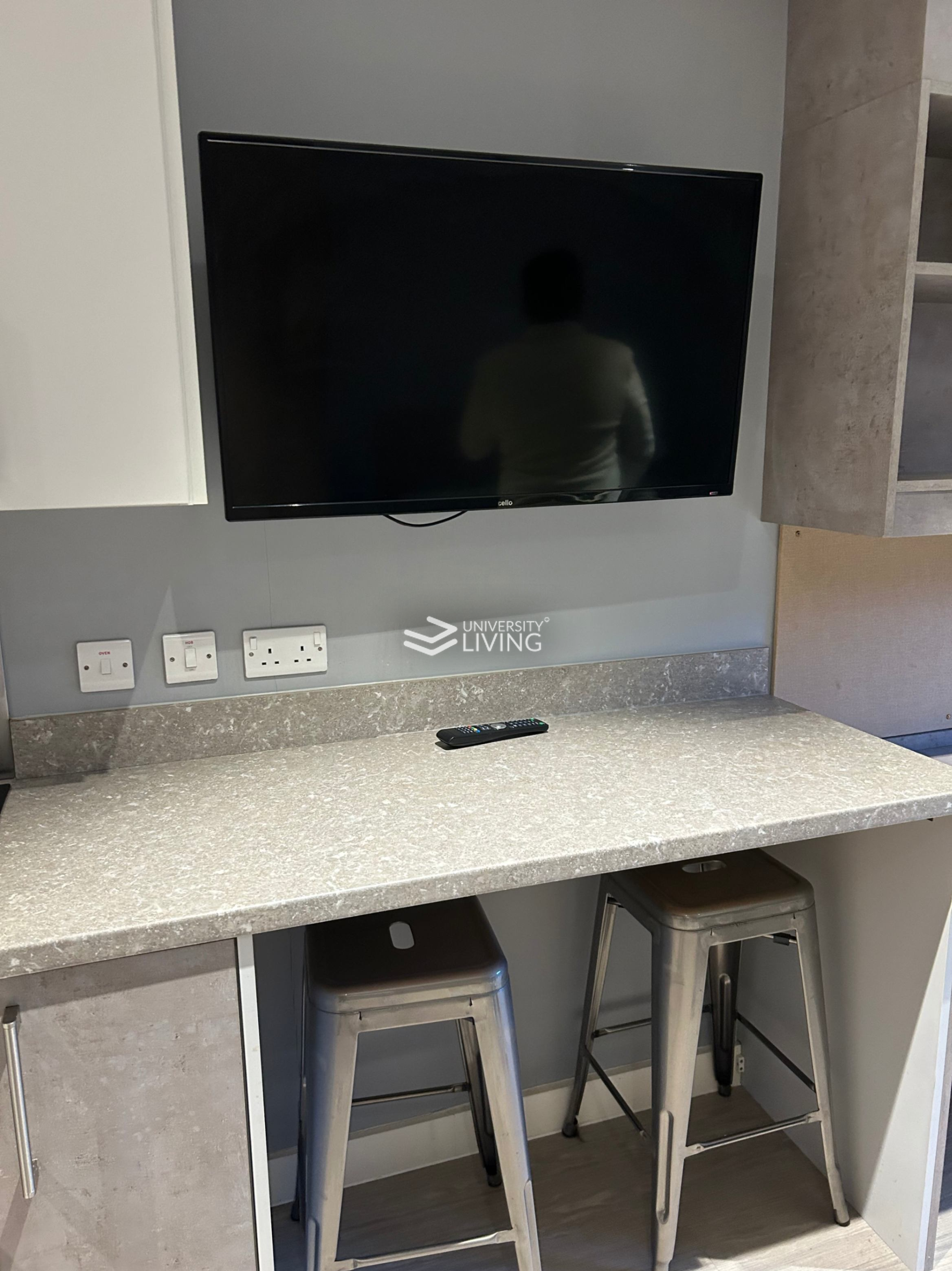 The Silver 2 Bed Apartment offers a comfortable shared living experience with the perfect balance of privacy and social space. Your room features a small double bed, wardrobe, under-bed storage, shelves and additional storage space to keep everything organised. A study desk with chair and a TV provide both a focused workspace and a place to unwind. Natural light from the windows creates a bright and welcoming atmosphere. You’ll have the convenience of an en-suite bathroom with a shower, washbasin and toilet for added privacy, while a shared kitchen gives you the opportunity to cook, dine and socialise with your flatmate.