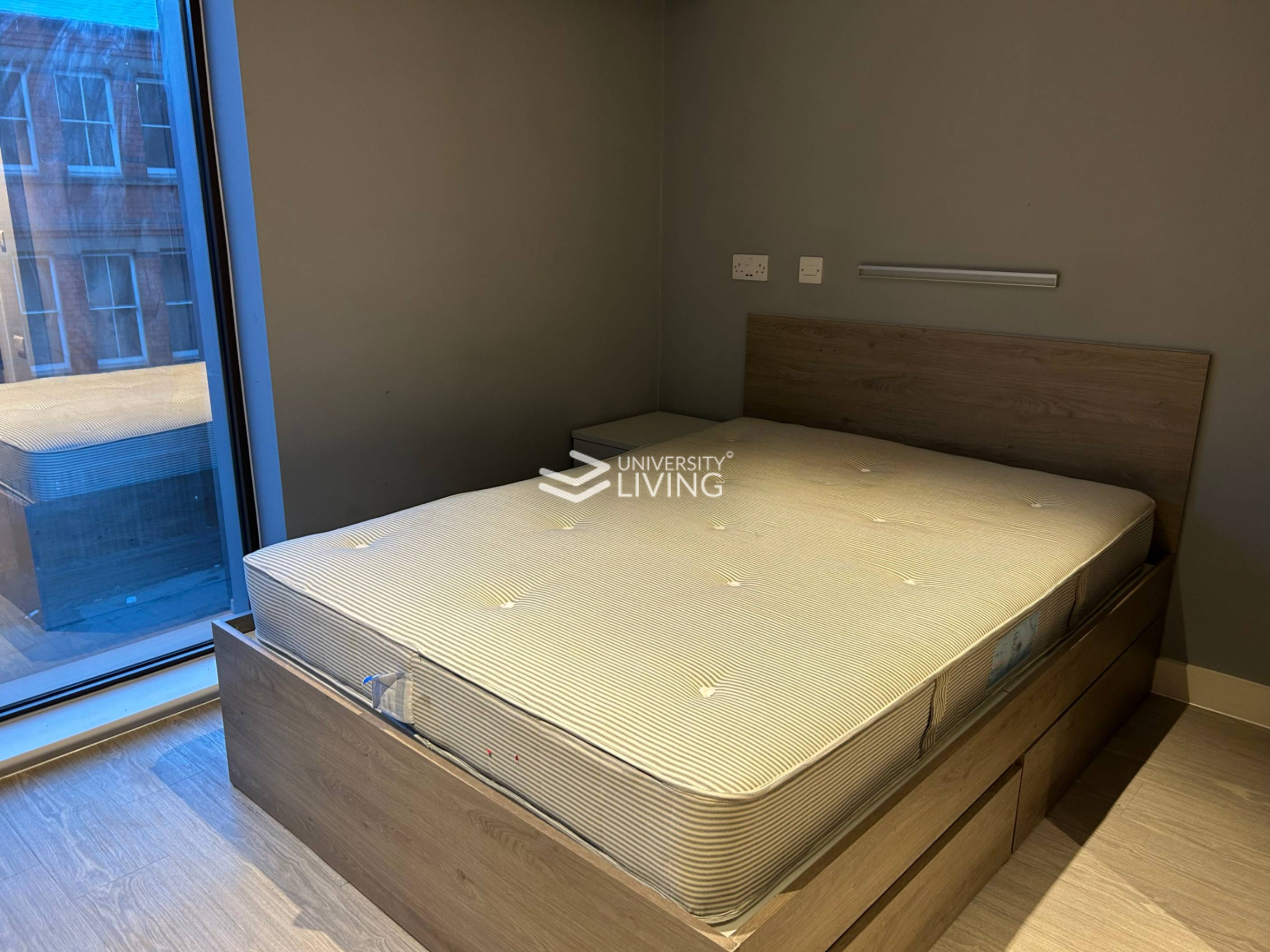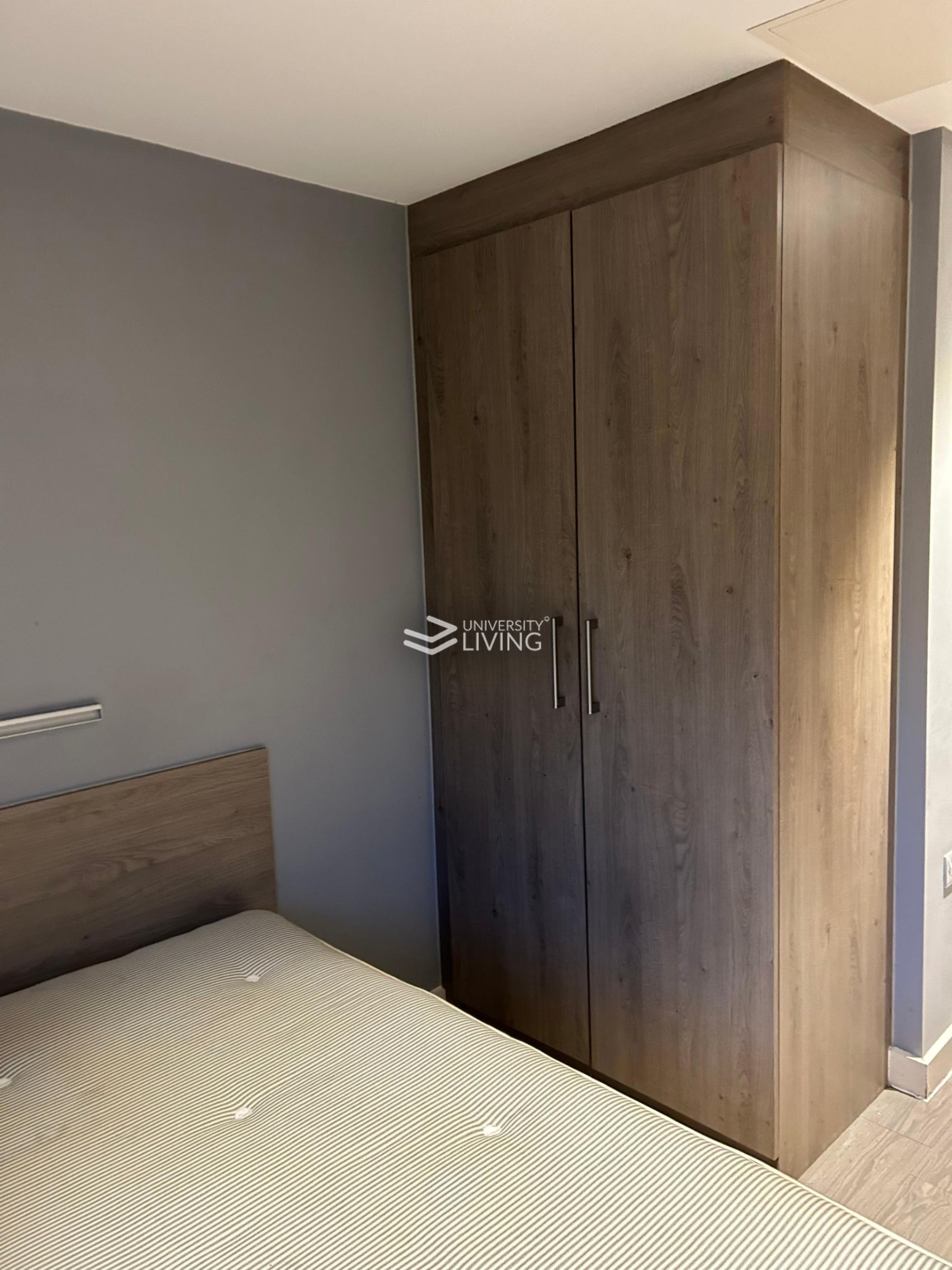 The Bronze 2 Bed Apartment offers a comfortable and practical living space ideal for sharing. Your room features a small double bed, wardrobe, under-bed storage, shelves, and additional storage space to keep everything organised. A study desk with chair and a TV provide both productivity and relaxation. Natural light flows in through the windows, creating a bright and welcoming atmosphere. You’ll have access to an en-suite bathroom with a shower, washbasin and toilet for added convenience. A shared kitchen is available, giving you the space to cook, dine and socialise with your flatmate while enjoying a balanced mix of privacy and community living.
